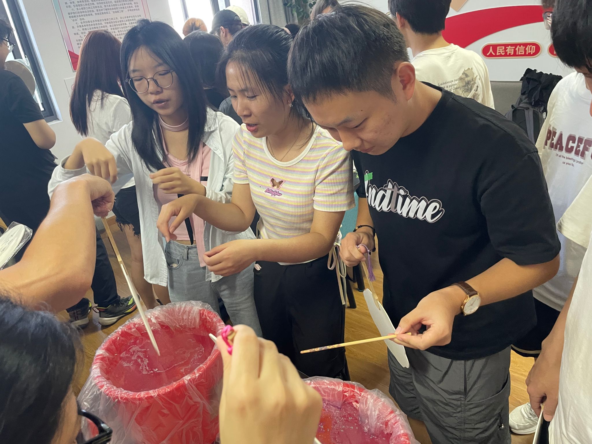 “将大漆颜料滴入水中,轻轻搅开,扇子要垂直浸入,入水时左右摇晃或轻微旋转……”在学生讲解员的指导下,学院师生不仅亲手体验了从选材、制胎到上漆、描绘的每一个制作环节,更在此基础上进行了大胆的创新与尝试。他们用自己的理解和创意,为传统漆扇注入了新的活力。
