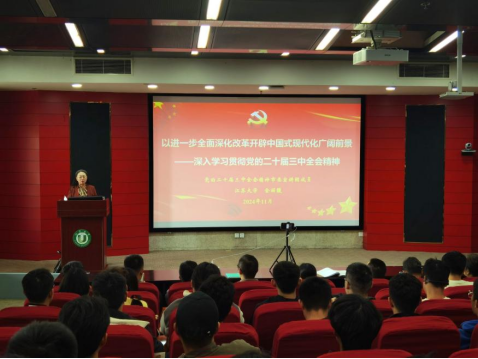 金丽馥围绕“以进一步全面深化改革开辟中国式现代化广阔前景”为主题,对《中共中央关于进一步全面深化改革、推进中国式现代化的决定》进行了全面深刻的解读。报告结合国家、江苏省、镇江市、学校和学院发展实际,重点讲解了党的二十届三中全会围绕全面深化改革,推进乡村全面振兴,在教育、科技、人才等领域的创新改革措施,指出了江大人和农工人的历史使命。同时强调了学习贯彻党的二十届三中全会精神是当前和今后一个时期的重要政治任务,必须切实把思想和行动统一到全会精神来。