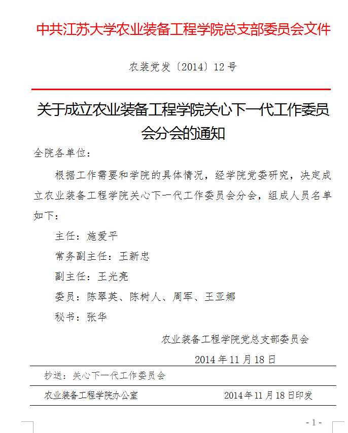 关于成立农业装备工程学院关心下一代工作委员会分会的通知