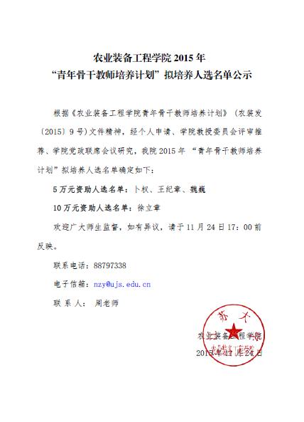 农业装备工程学院2015年“青年骨干教师培养计划”培养人选初选名单公示