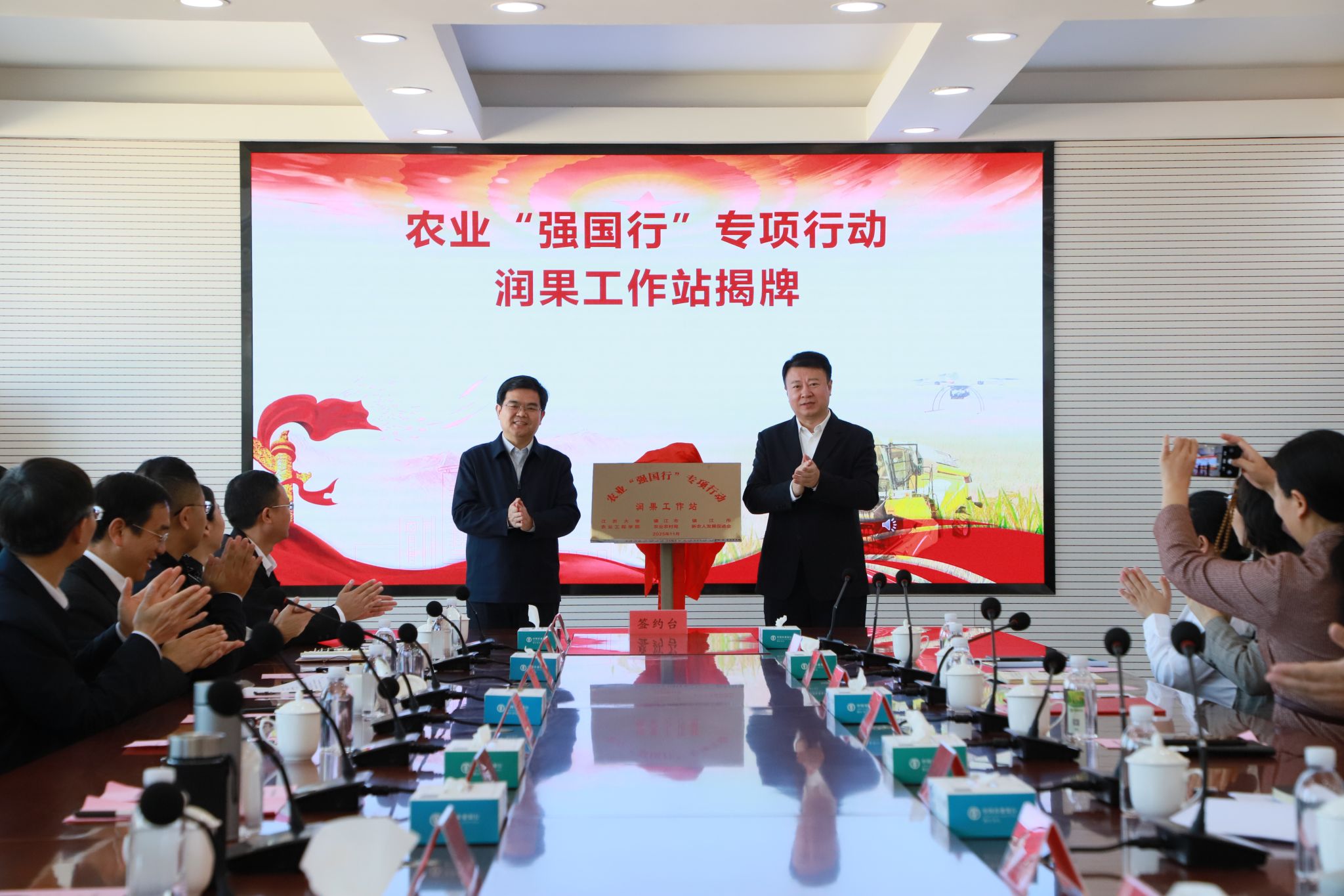 51吃瓜 党委书记李洪波与镇江经济技术开发区党工委书记、管委会主任李朝阳为农业“强国行”专项行动润果工作站揭牌。